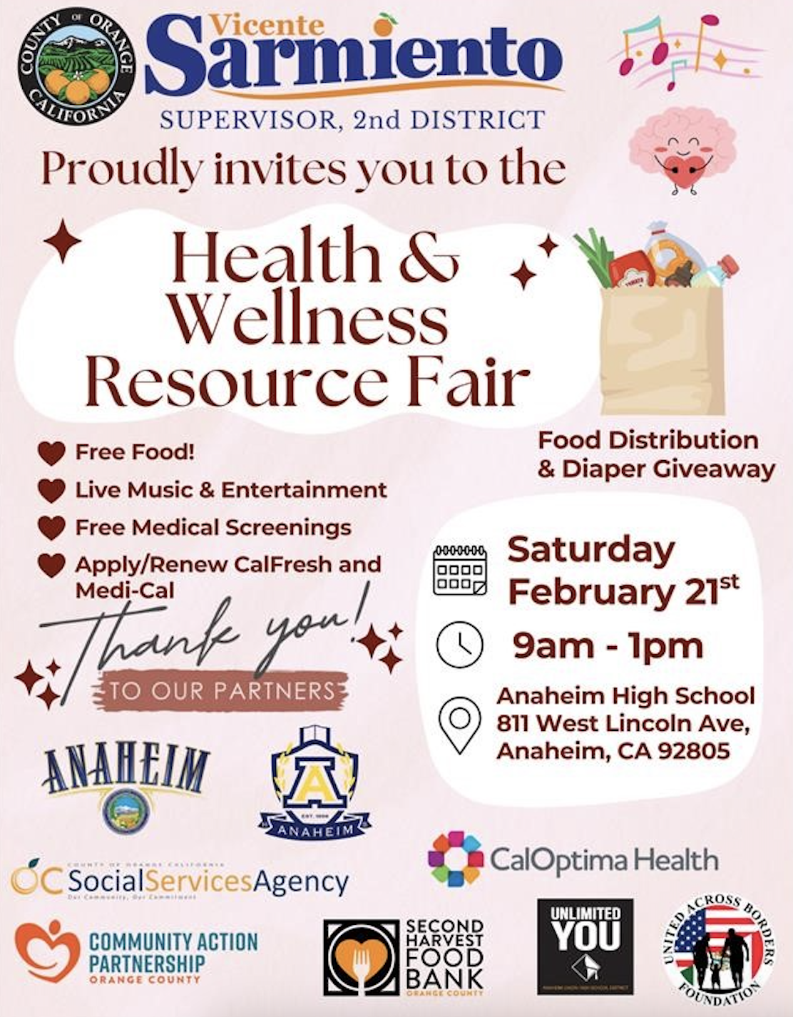 County of Orange Second District Supervisor & First 5 Orange County Board Vice Chair Vicente Sarmiento is hosting a free Health & Wellness Resource Fair designed to support families with young children. Enjoy free food, live music and entertainment, medical screenings, and a food distribution and diaper giveaway. Families can also get help applying for or renewing CalFresh and Medi-Cal, and connect with local organizations offering health, nutrition, and family support resources. First 5 OC will also be providing a resource table as well as Kid Builder activities.